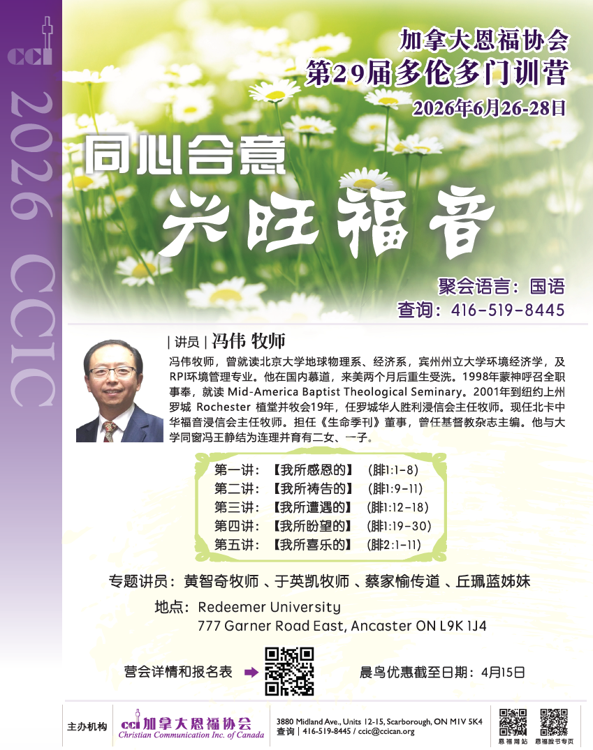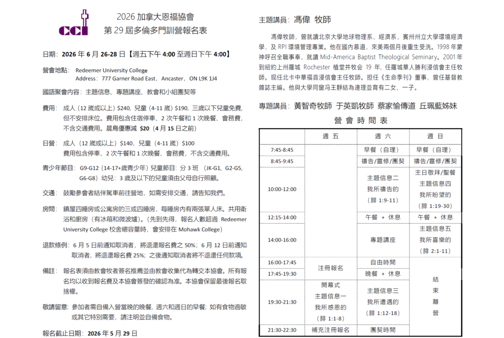 / Upcoming Events / 作者: admin 2026年第29届恩福多倫多門訓營 點擊下載報名表 專 題 講 員 專題一:如何吃書卷?講員介紹:黃智奇牧師是基督教研究碩士、道學碩士、神學碩士。1954年生於香港,1979年蒙恩得救。1981年開始全時間服事主。著有系列啓發式小組查經書、《全備的救恩》、《亦有仁義:基督教傳教士與鴉片貿易的鬥爭》、《尊重神神必看重》、《決志之後》等。 專題二:從祈求到尋求講員介紹:于英凱牧師出生成長于中國大陸,大學畢業後曾先後就職於國家機關和在華外企。而立之年全家移民加拿大並先後信主。工作期間,曾被派回中國工作數年。2011年領受呼召讀神學,畢業後一直在華人教會國語群體中全職服侍至今。 專題三:為使命而養育講員介紹:丘珮藍姊妹畢業於多倫多大學,主修特殊人類教育和幼兒教育,持有生命教練(life coach)證書。曾任多倫多中華福音宣道會家庭與兒童事工主任一職。二十餘年來致力於輔導父母、夫妻和青少年,提供各類的親職教育課程。目前於Tyndale神學院攻讀碩士學位主修輔導,擔任恩福特約兒童家庭事工同工。 專題四:大使命與我何干?講員介紹:蔡家愉傳道生長於數代基督教家庭,自少年開始參與不同崗位的事奉,包括司琴、伴奏、領詩、帶領不同年齡的詩班,參與合唱團等。從事電腦專業二十多年後,於2002年回應呼召進入全時間服事。多年來除在不同教會作牧養,亦作宣教、培訓、並在護理院藉音樂等服事。 Youth Program Theme ROOTED: Identity. Purpose. A life that lasts. Speaker: Betty Chang Topic📘 Workshop 1: Who am I?📘 Workshop 2: Why am I here?📘 Workshop 3: How do I live well?🎯 Saturday afternoon: Activity🎵 Saturday night: Worship, Praise & Share📖 Sunday sermon: When knowing isn’t enough💬 Sunday afternoon: Panel discussion