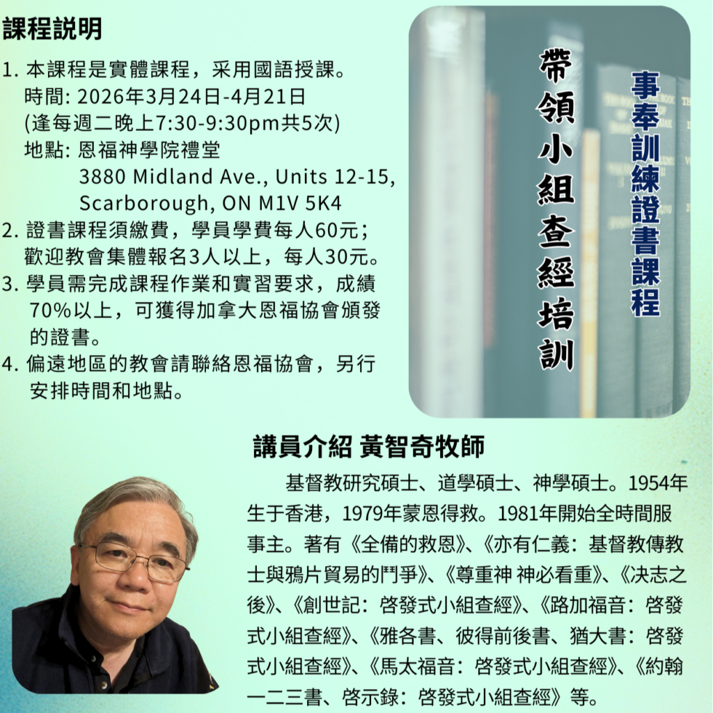 課程内容: 通過示範、指定書卷的單獨預備、集體研討和點評,讓學員更多操練和掌握帶領小組查經的方法。時間: 3月24日-4日21日 逢週二晚 7:30-9:30共5次 地點: 恩福神學院禮堂